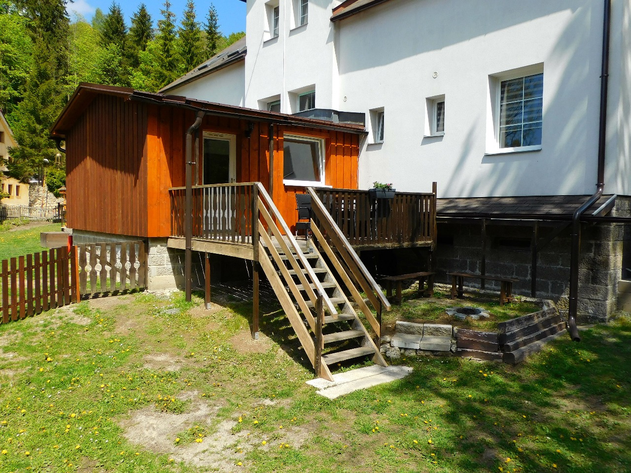 K dispozici venkovní posezení na terase, gril a ohniště.