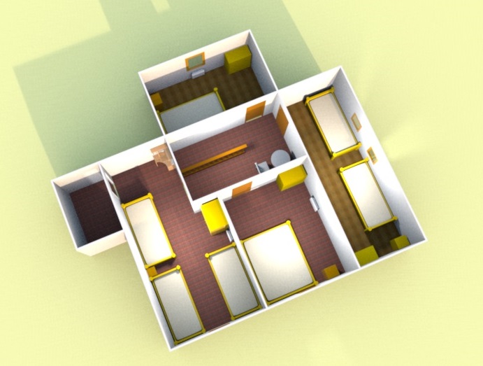 Ve 2. podlaží jsou čtyři samostatné pokoje (1x jednolůžko, 2 x jednolůžko, 1 x dvoulůžko, 3 x jednolůžko) a chodba s posezením.